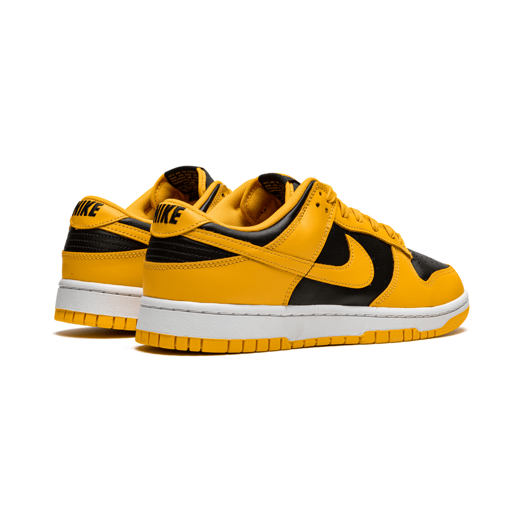 La Nike Dunk Low « Goldenrod » est une colorway originale du modèle classique, lancée en 1985 dans la collection « Be True to Your School » inspirée du basketball universitaire. Surnommée aussi « Varsity Maize » ou « Iowa », cette version bicolore associe un cuir noir perforé sur la pointe, le panneau central et le col à des superpositions et un Swoosh en cuir jaune Goldenrod éclatant. Le talon arbore une broderie « Nike » rétro en noir, tandis que le logo « Nike » et le Swoosh imprimés en Goldenrod complètent ce design vintage emblématique, qui a également inspiré le mythique Dunk High « Wu-Tang » de 1999.